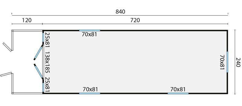 840 x 240 cm 20,15 m2 Husvogn - Cirkusvogn Jimmy 19 mm ubehandlet med veranda
