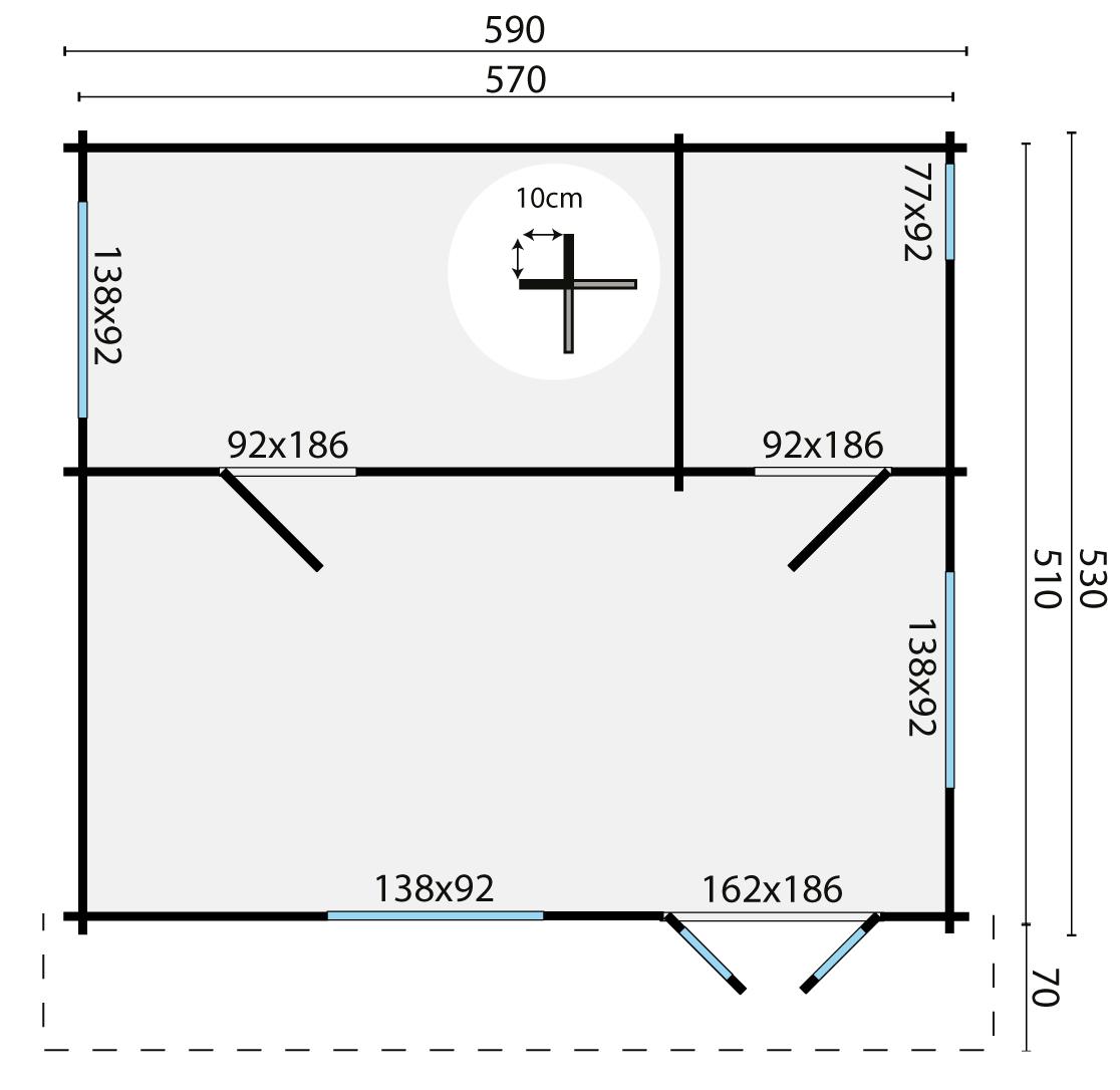 Bjælkehytte Sachsen 598x500x290cm 44 mm med veranda