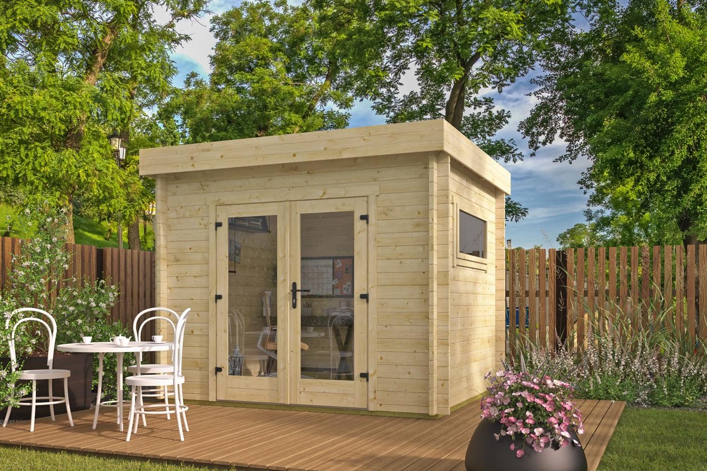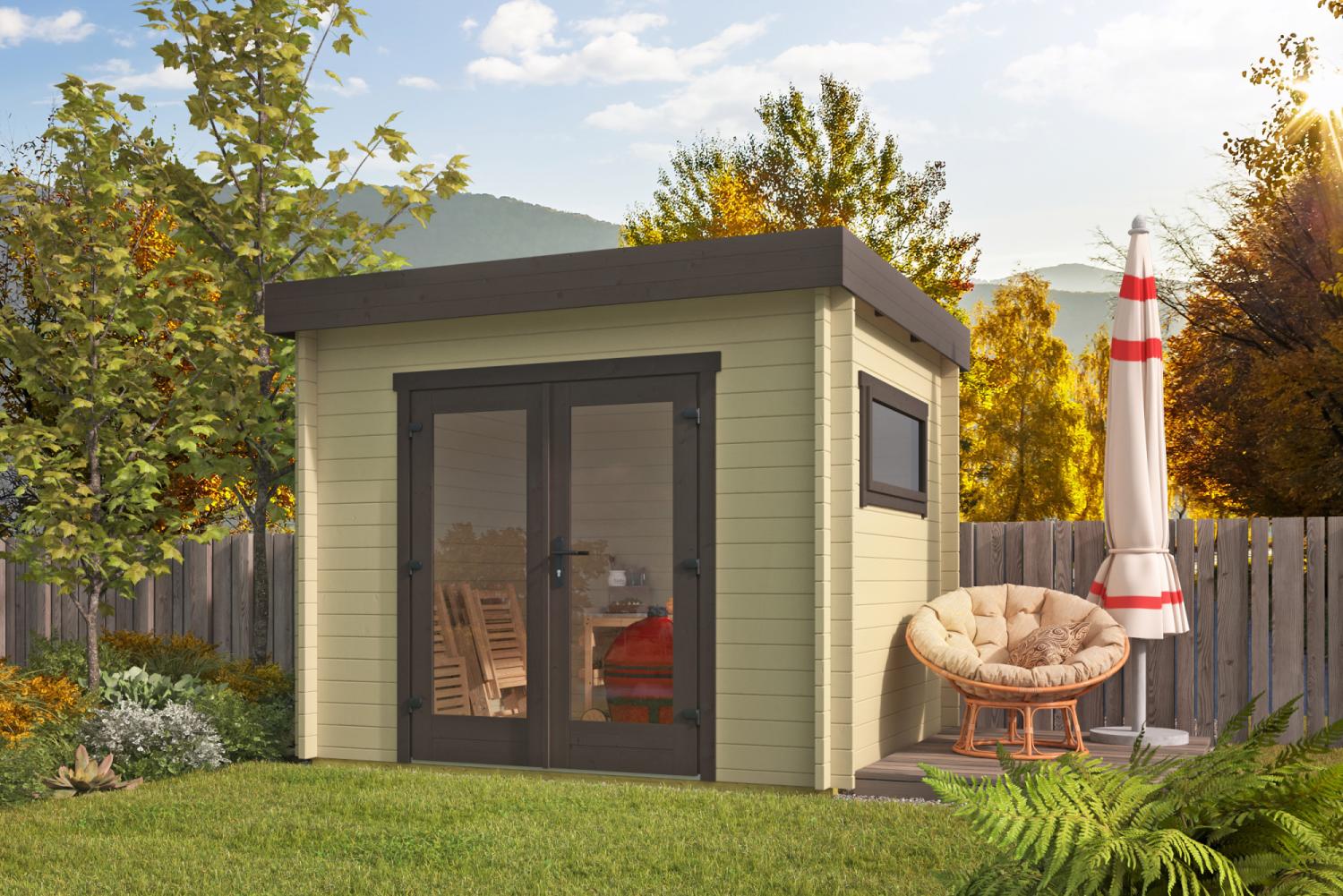 Fordele: Kompakt – perfekt til smalle haver og små grunde Lys og indbydende med stor glasdør og sidevindue Solid konstruktion i 40 mm gran, designet til nordisk klima Inkl. fundament, gulv, lås og monteringssæt Moderne design – velegnet til kontor, anneks eller fritidsrum Pris.Stk.Fra