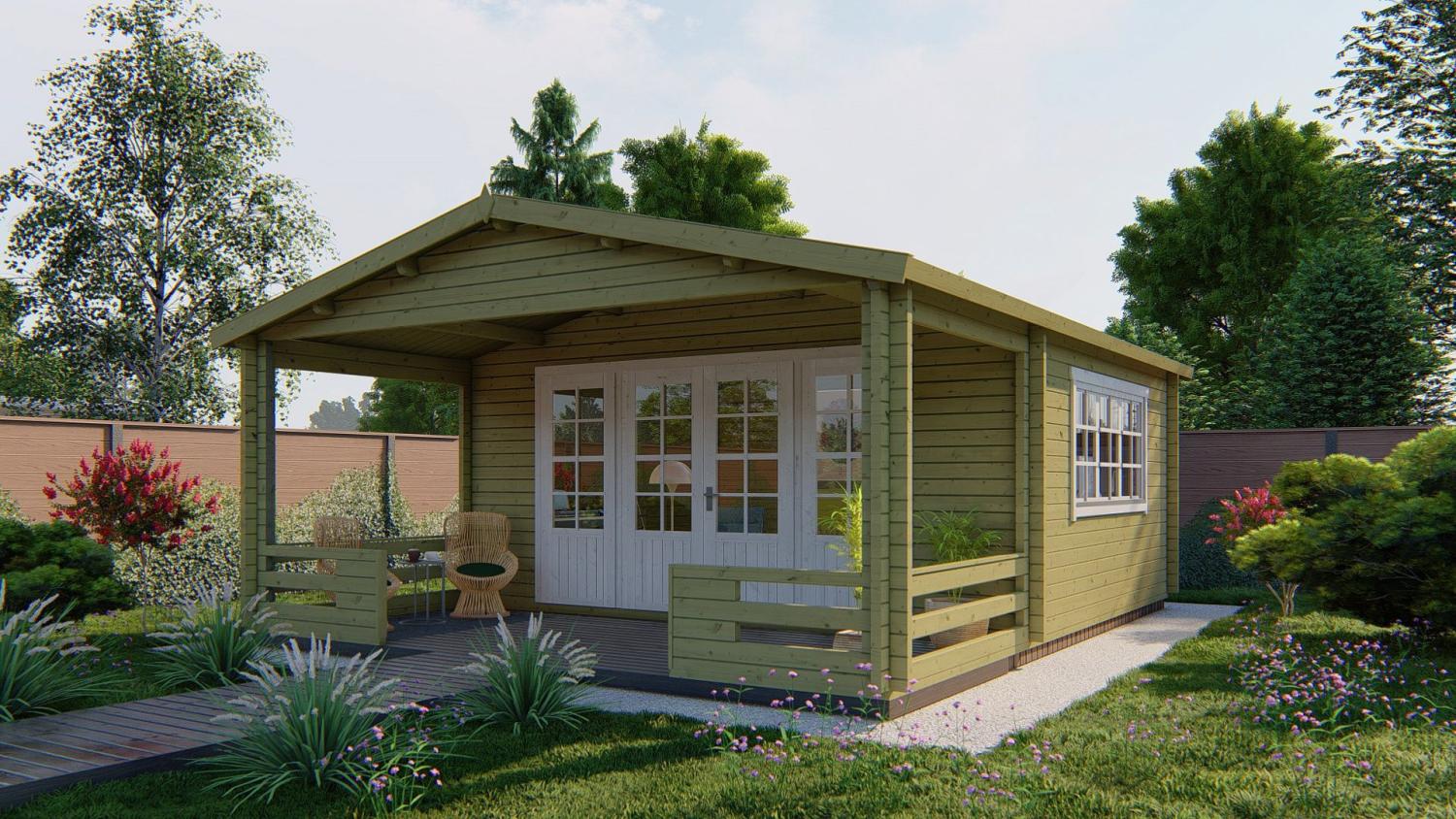 Hytte / Gæstehus Rune 70 mm 595x795x277 cm MED PVC VINDUER OG DØRE
