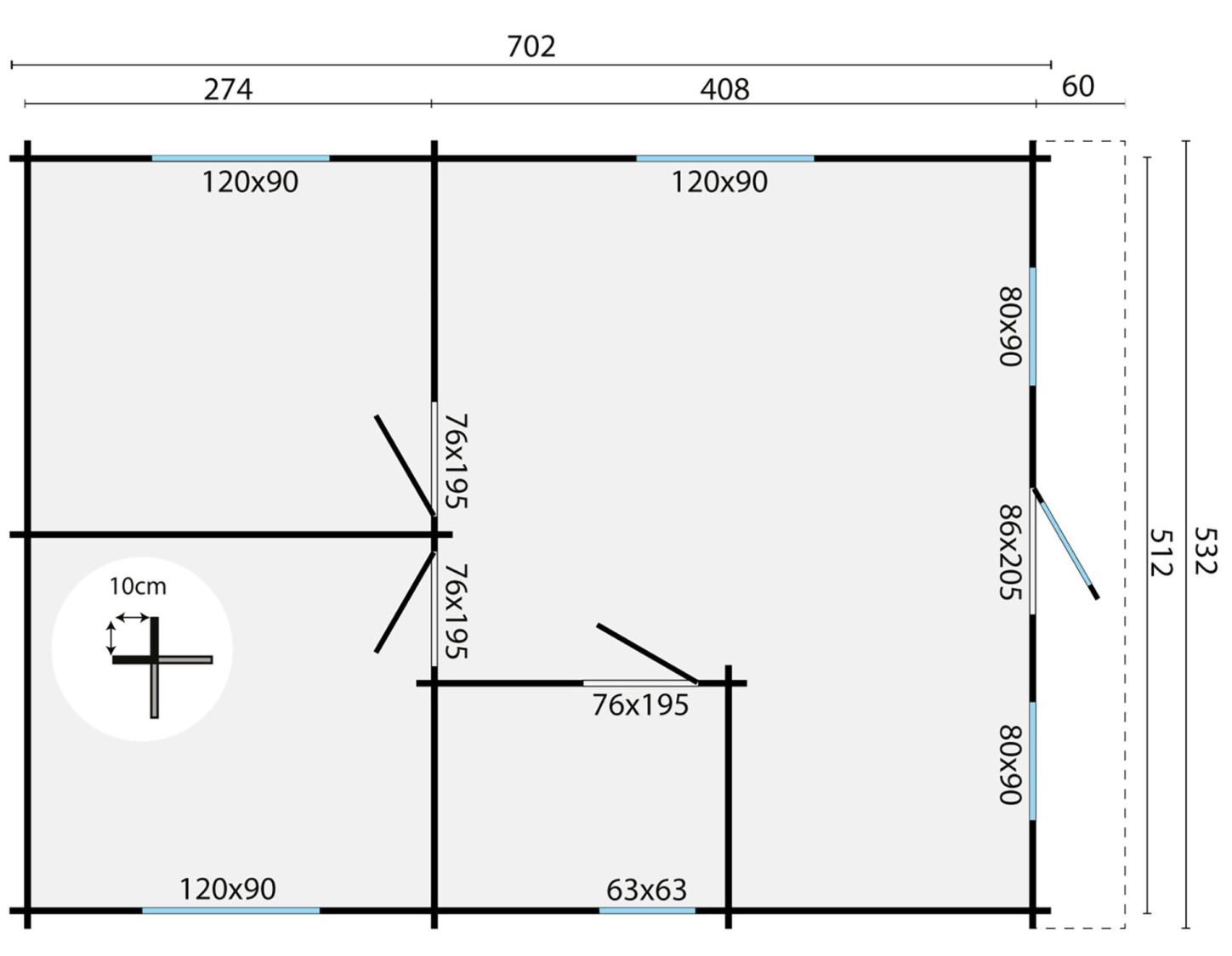 Hytte / Gæstehus Rune 70 mm 595x795x277 cm MED PVC VINDUER OG DØRE