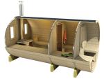Stor saunatønde i træ Ø205 x 400 cm med 2 rum, tagshingles, glasdør og 40 mm vægtykkelse. Plads til 4–6 personer. Perfekt udendørs sauna til haven eller sommerhuset. Leveres som byggesæt – klar til el- eller brændefyret saunaovn.
