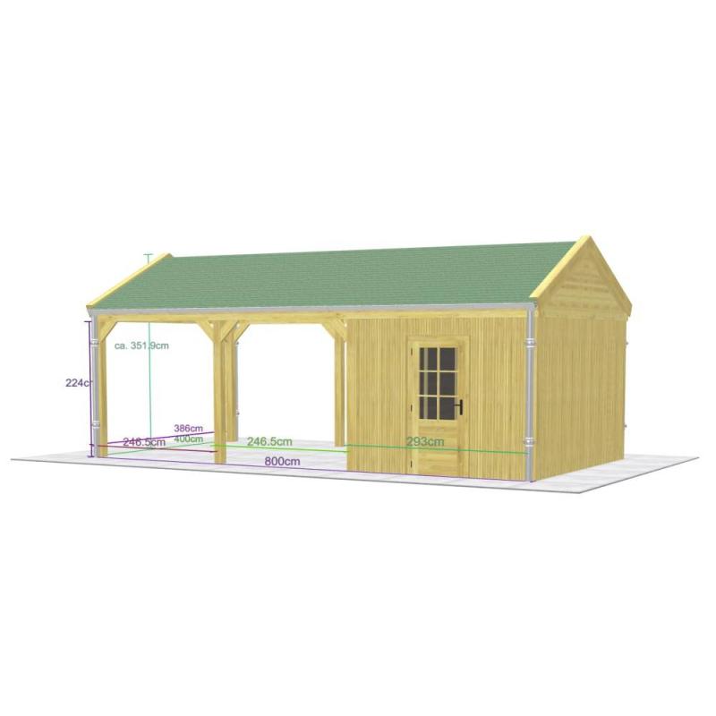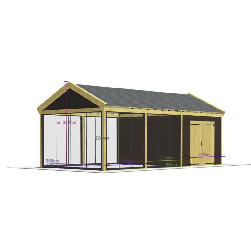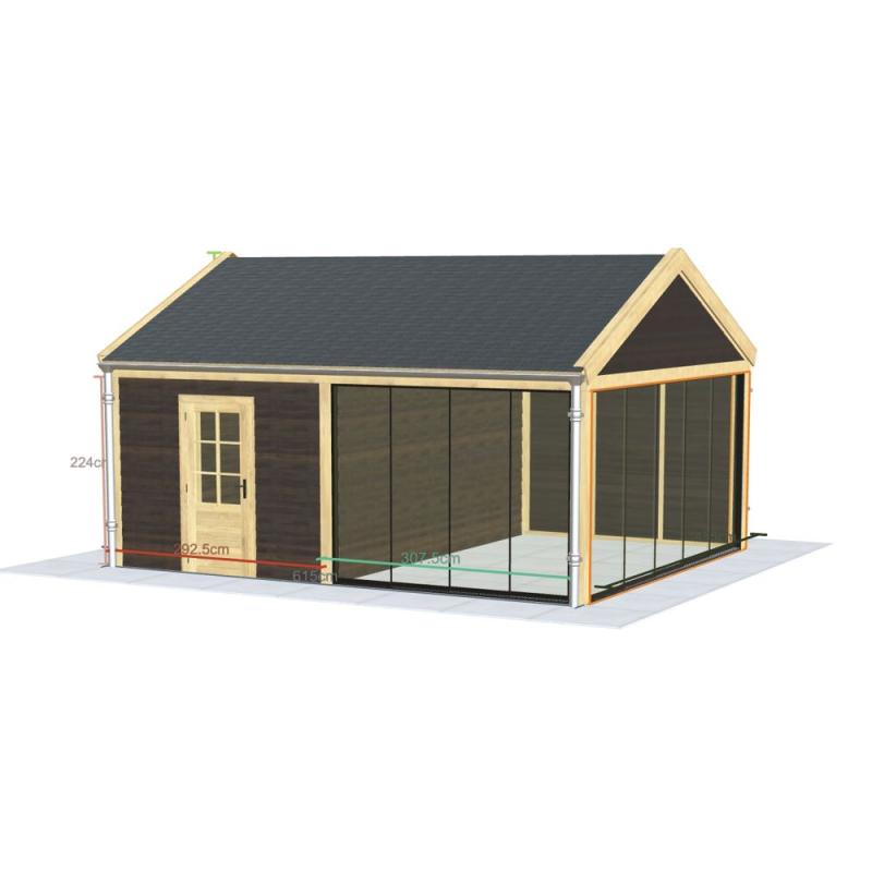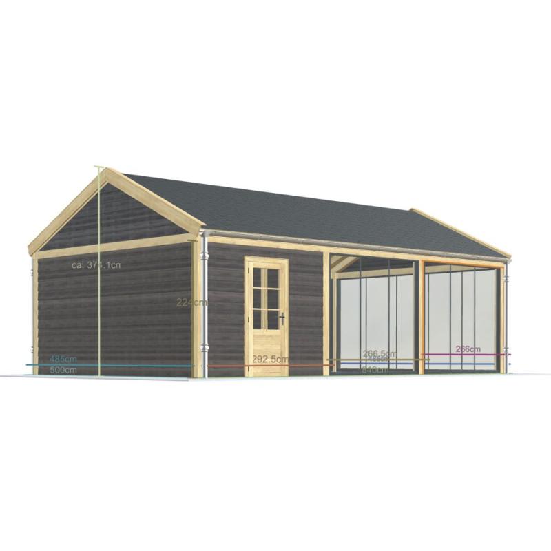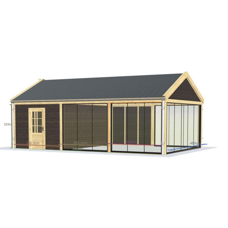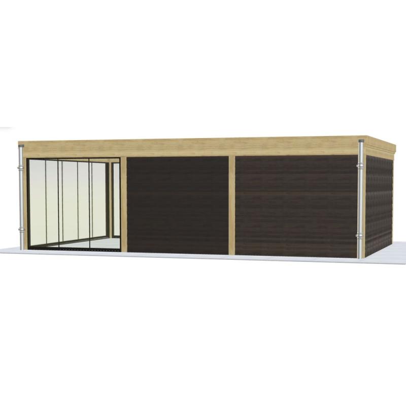 Her har vi tilføjet et praktisk opbevarings- eller hobbyrum samt elegante glasskydedøre i både side og gavl. Standardmodulet kan opbygges op til 20 m i længden og 5 m i bredden, med enten sadeltag eller fladt tag. Gavelbeklædning fås i sortmalet eller ubehandlet Douglas, og sider kan tilføjes fag for fag i samme eksklusive materialer.