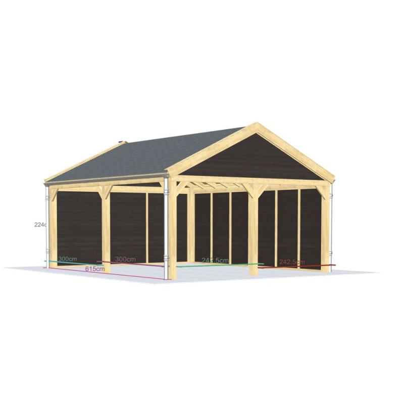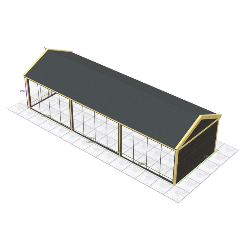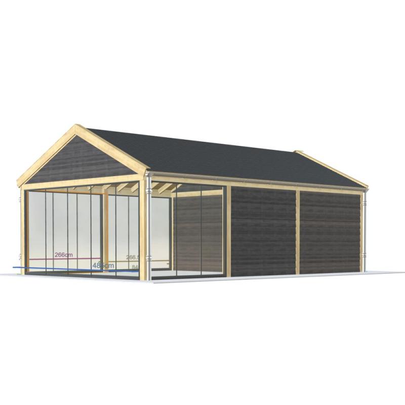 Her har vi tilføjet ekstra fag i længden og tre sider med elegante glasskydedøre, som skaber et lyst, åbent og eksklusivt udtryk. Standardmodulet kan opbygges op til 20 m i længden og 5 m i bredden og leveres med enten sadeltag eller moderne fladt tag. Gavelbeklædning fås i sortmalet eller ubehandlet Douglas, og sider kan tilføjes fag for fag i samme eksklusive materialer. Mulighed for integreret opbevarings- eller hobbyrum giver ekstra funktionalitet